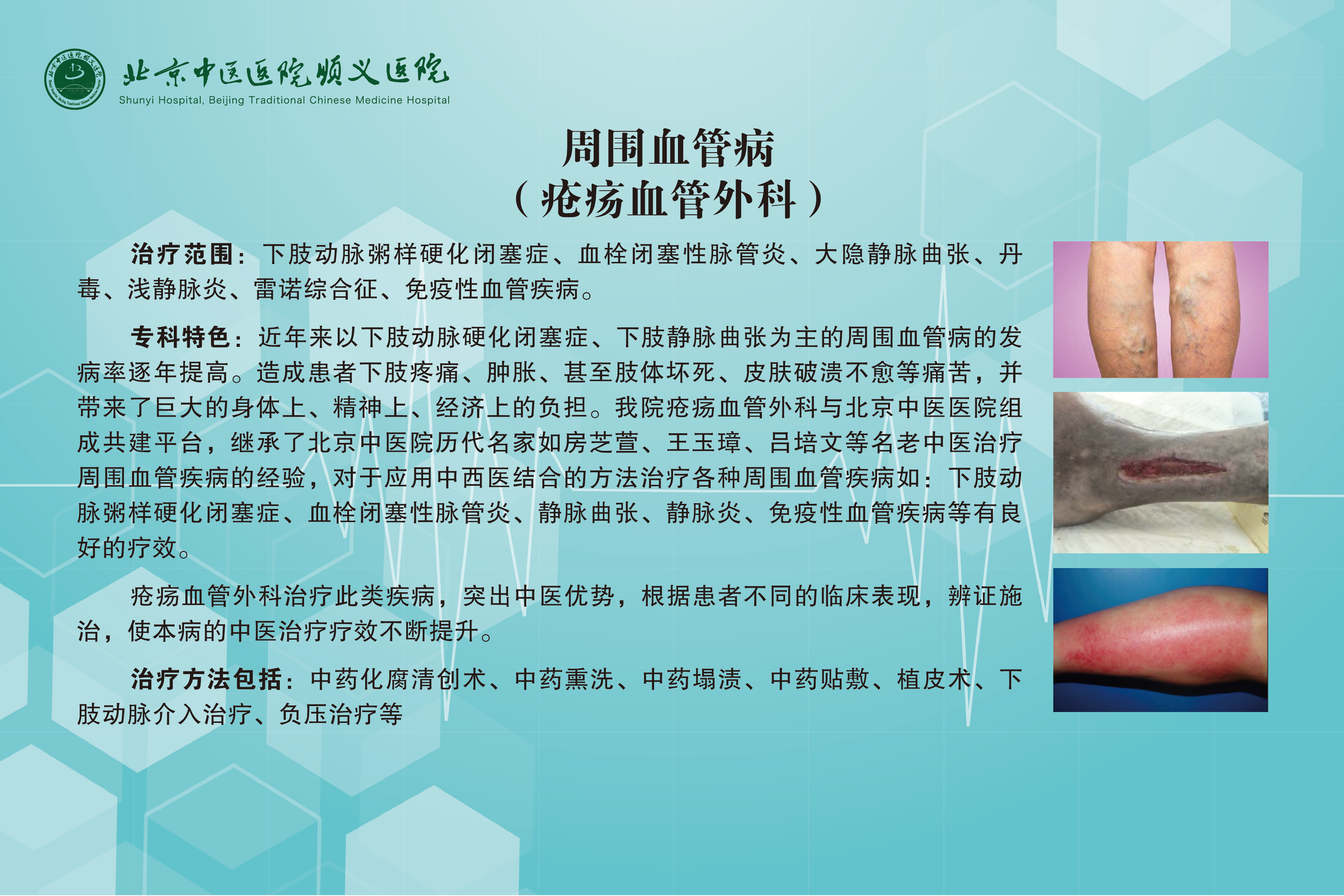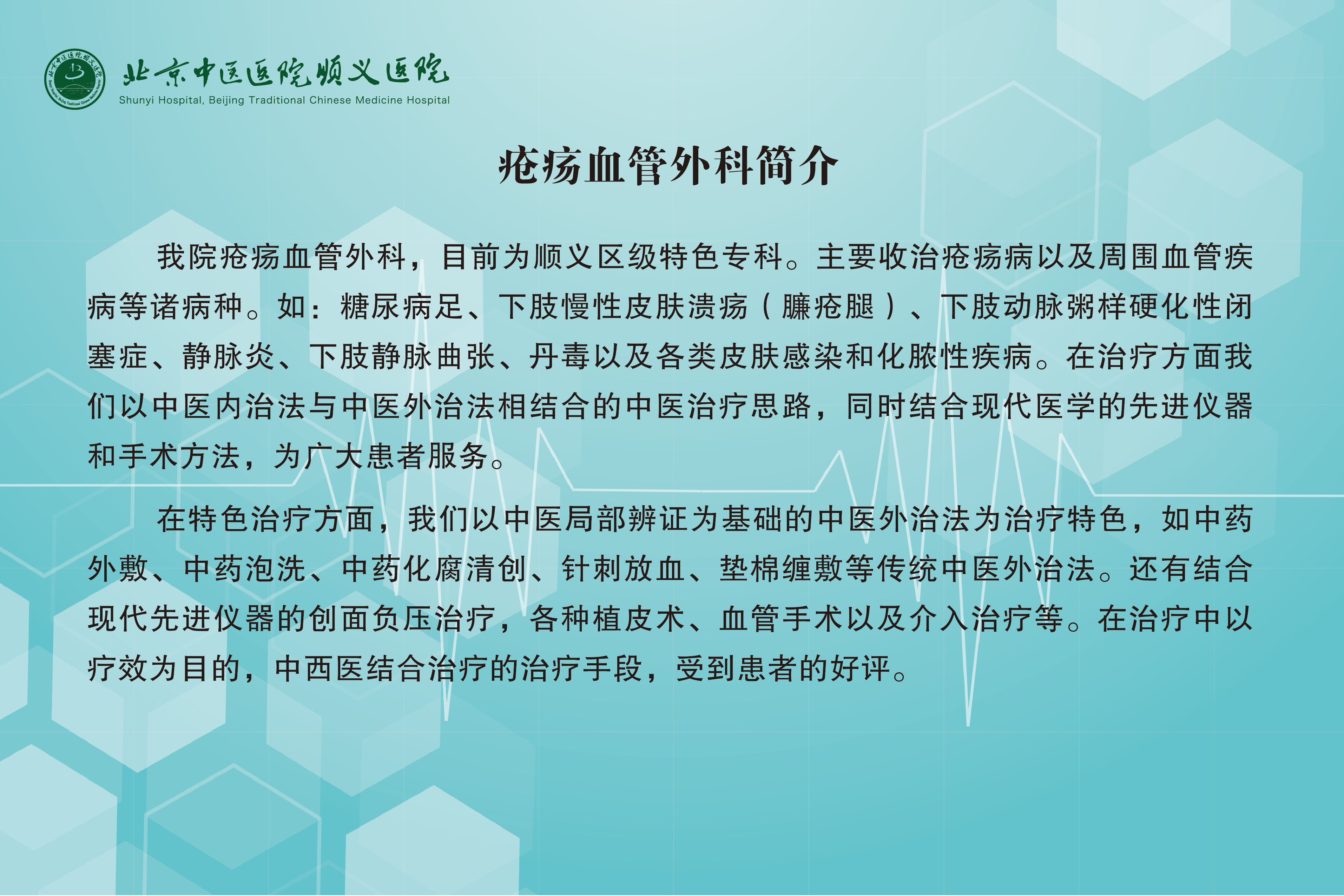 前病房床位共开放10张,主要专注于创面修复以及周围血管疾病诊疗两大核心领域。以中医内外治法相结合的中医治疗思路,开展中医特色治疗,如中药外敷、中药泡洗、中药化腐清创、针刺放血、垫棉缠敷等,同时结合现代医学的先进仪器和手术方法,如创面负压治疗,各种植皮术、血管手术以及介入治疗等。