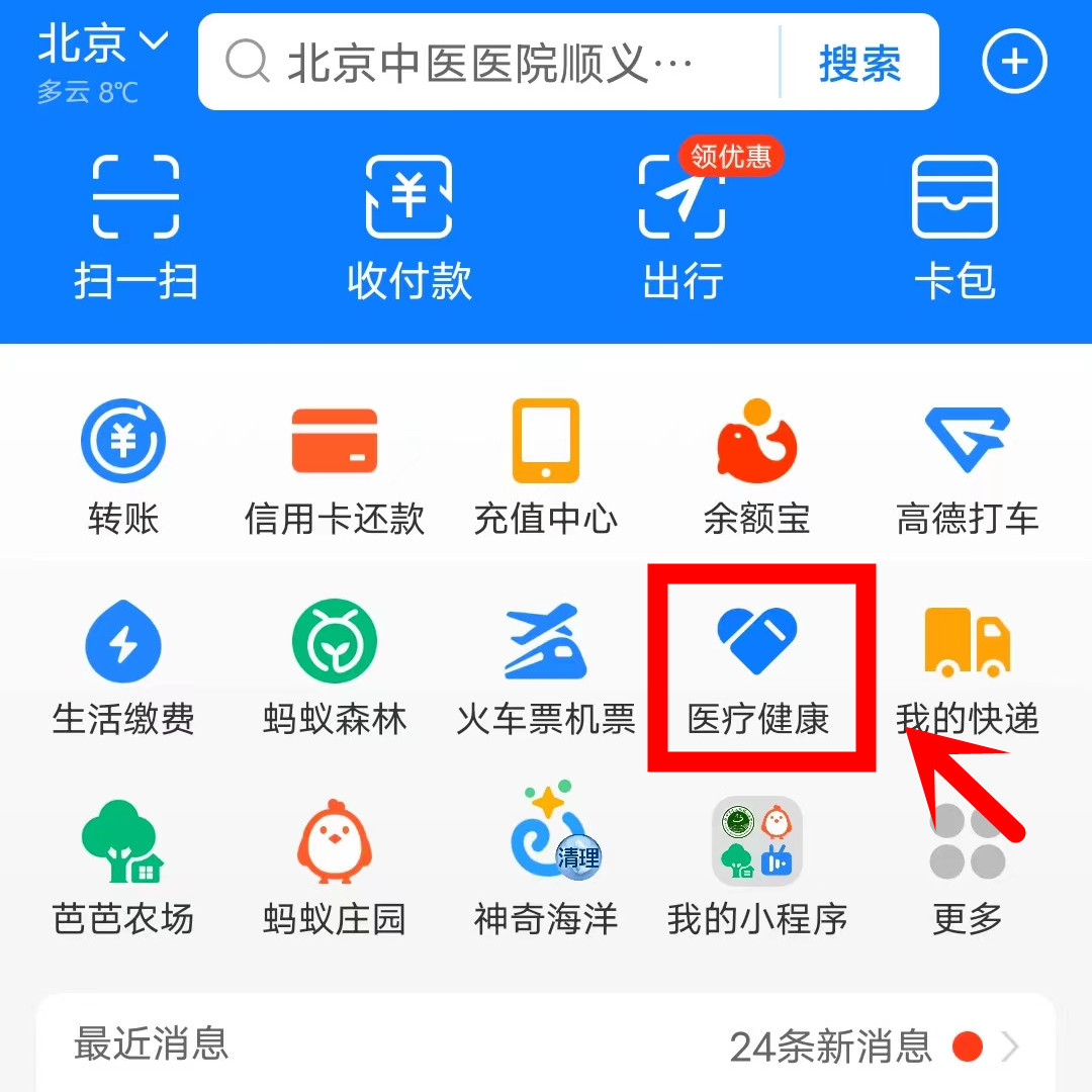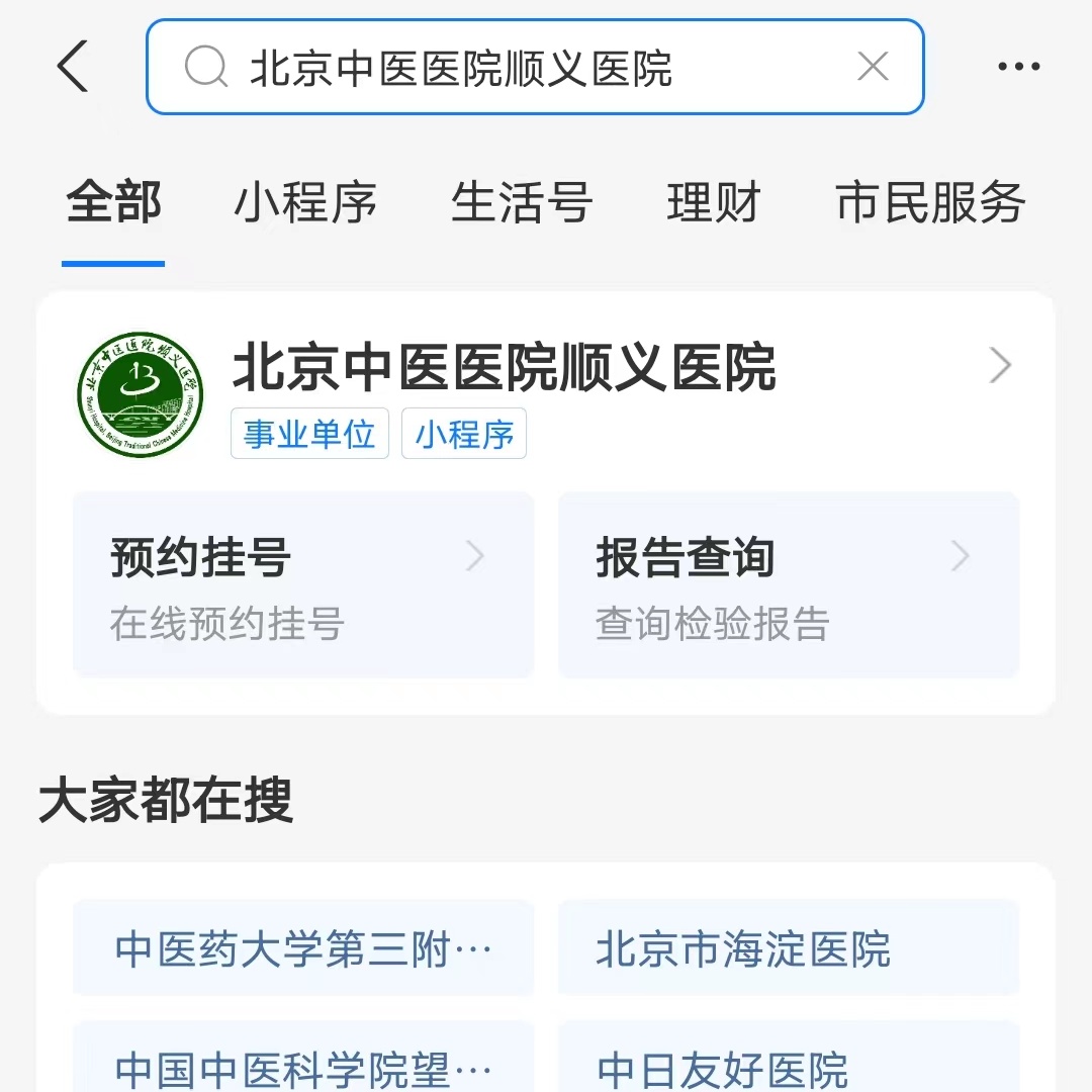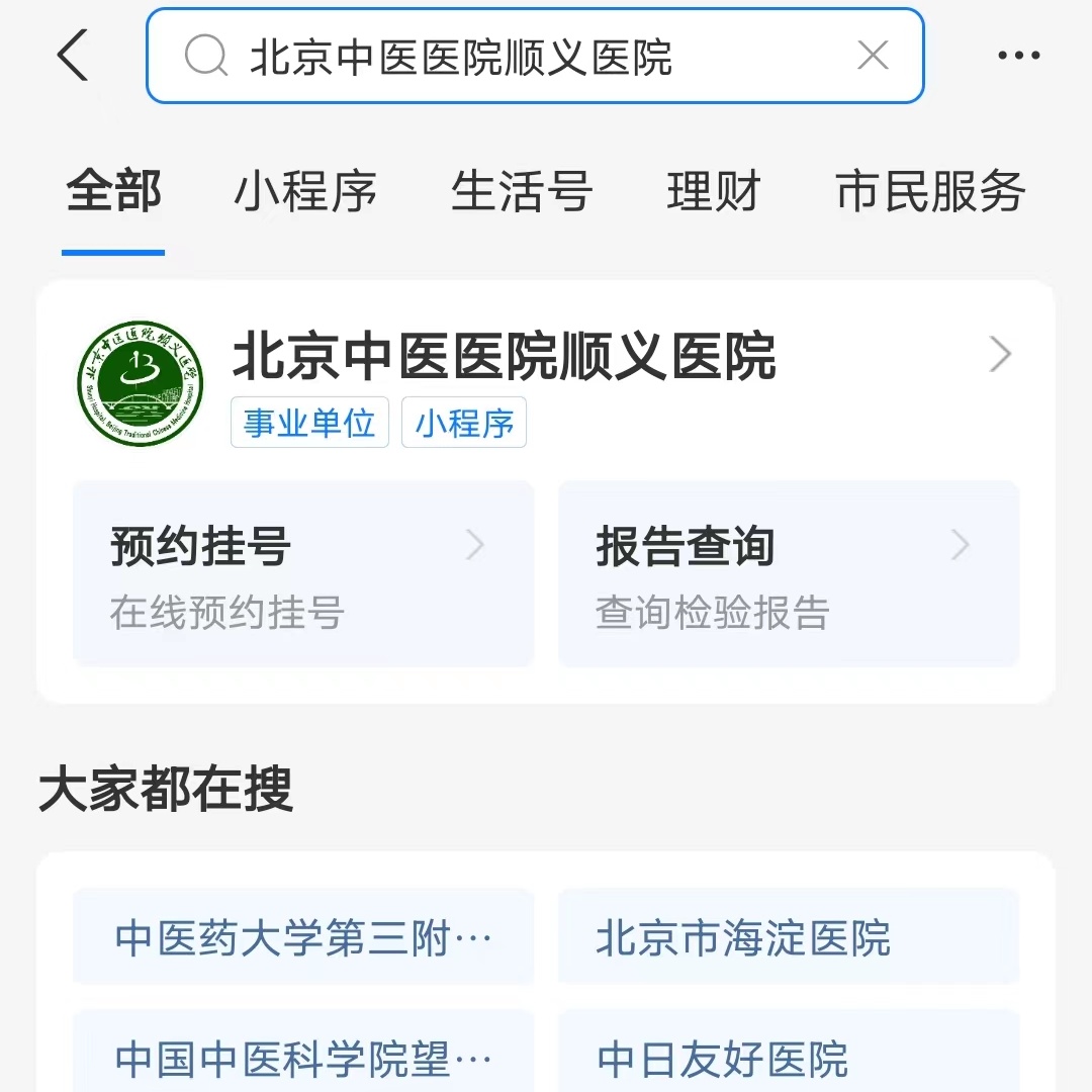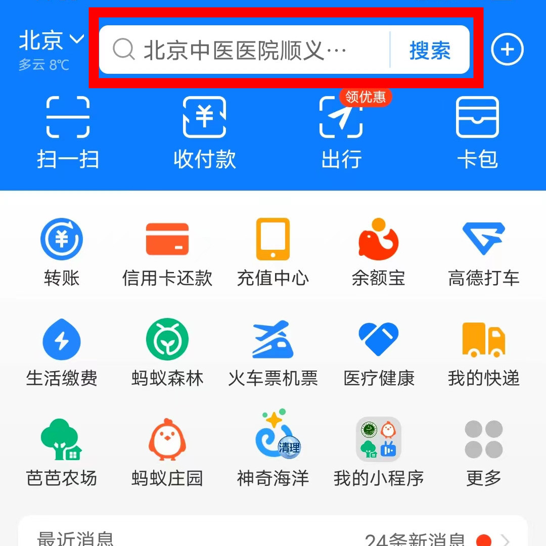 ① 打开支付宝,在首页搜索框中输入“北京中医医院顺义医院”