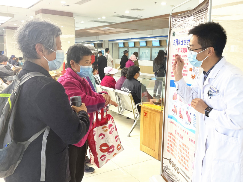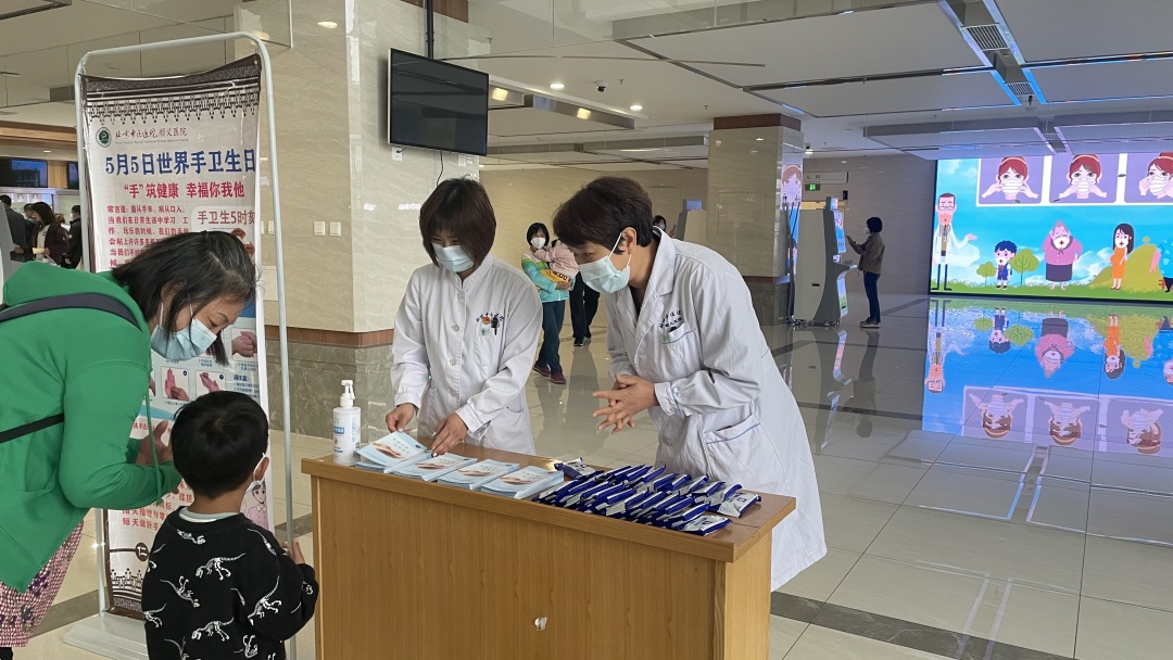 5月5日上午,医院感染管理办公室在门诊大厅举办了手卫生健康宣传活动,通过大厅电子屏幕、宣传折页等方式为患者及家属讲解手卫生知识内容。