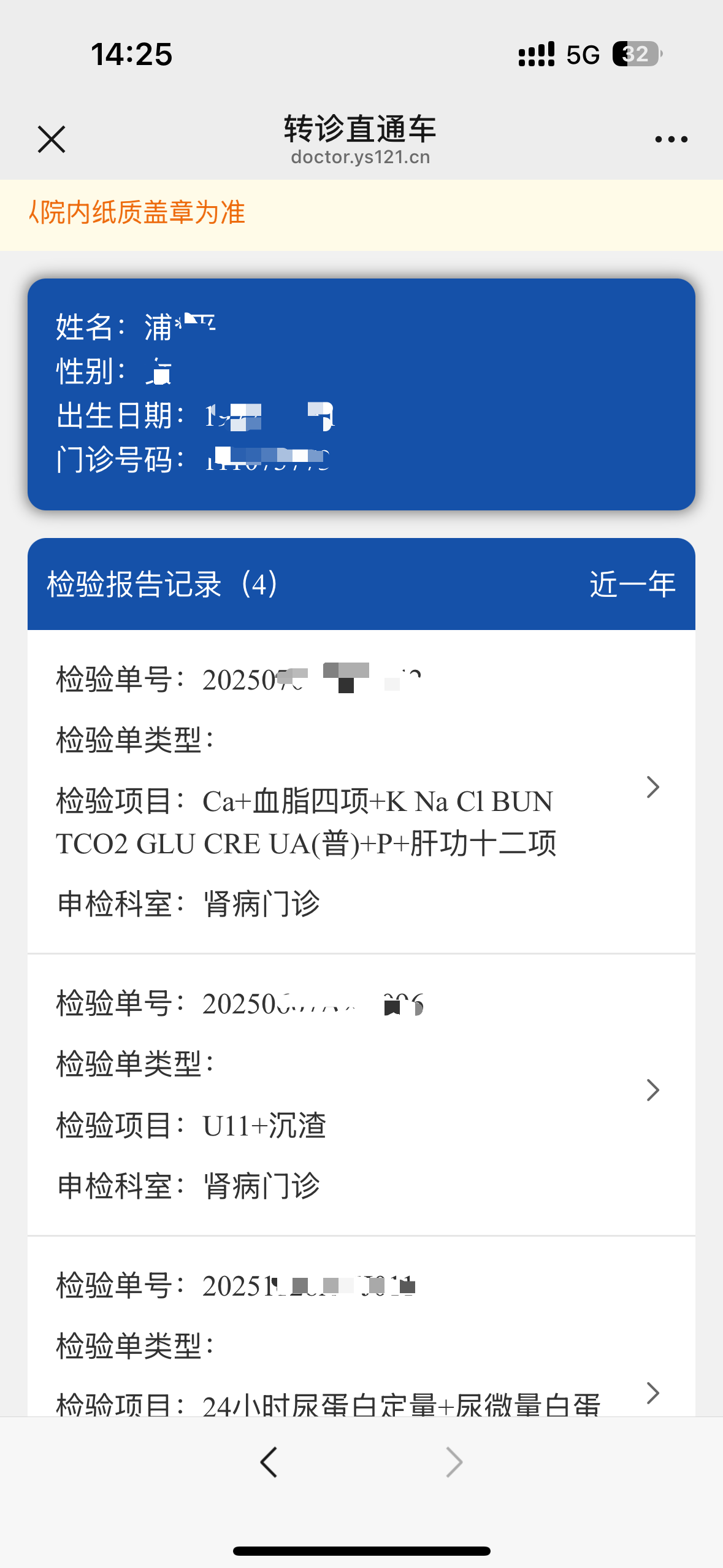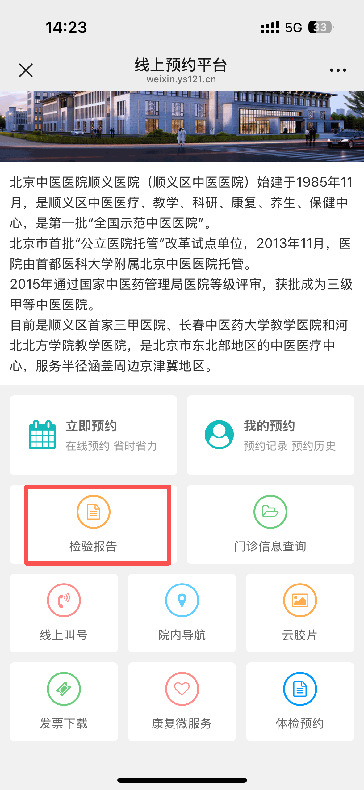 在预约挂号页面,点击“检验报告”进行查询
