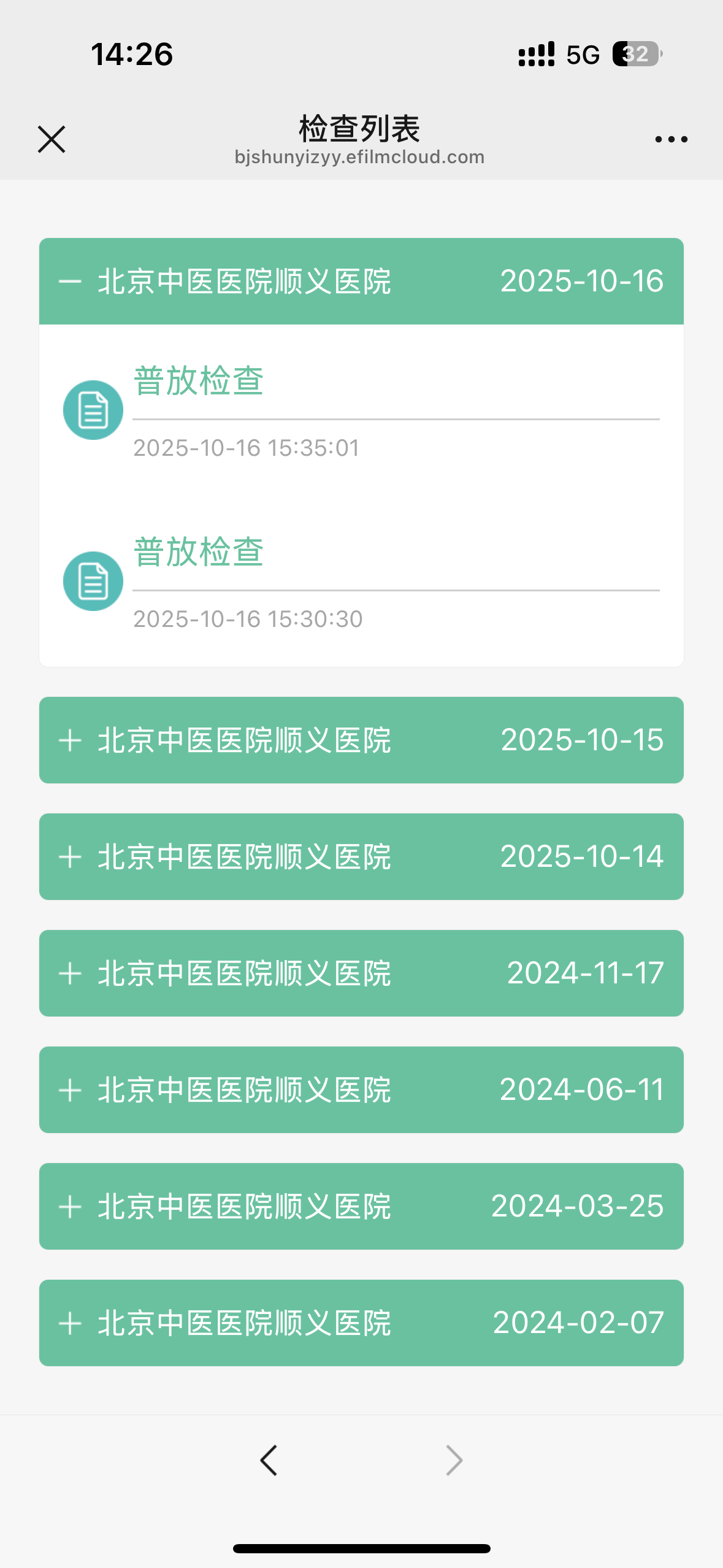 进入检查结果列表页,可查询近一年内的检查结果,点击某一条检查记录,可查看详细数据