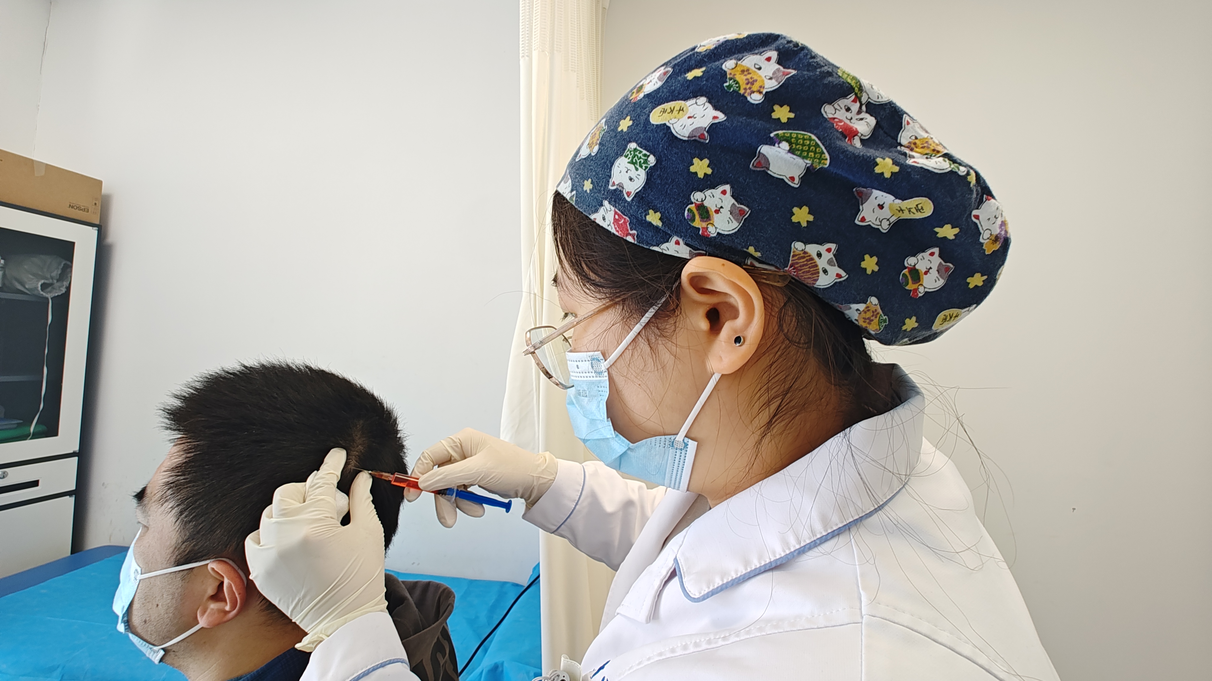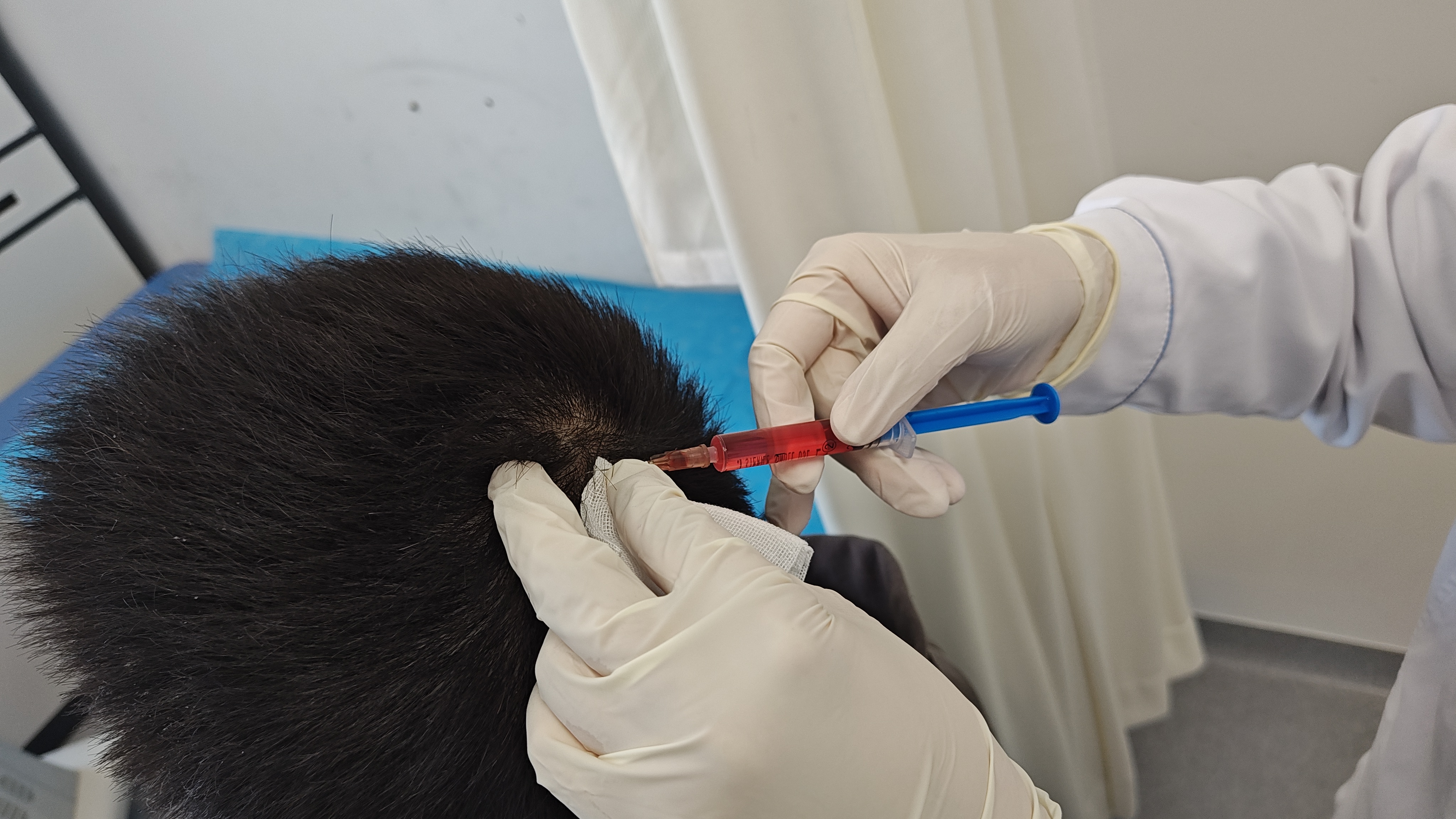 技术介绍:穴位注射是现代皮肤科已广泛开展的一项中西医结合治疗技术,皮肤科目前开展的头皮穴位注射治疗,是通过中医辨证论治,在患者头部选穴、注射,通过刺激头皮穴位,把气血“调动”到“局部战场”,配合中药汤剂能“定向打靶”,调节局部神经功能,改善头皮血液循环,为头发生长创造良好的环境。